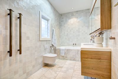 Lux renovated family bathroom with heated floors & towel rails, designer tapware & fittings