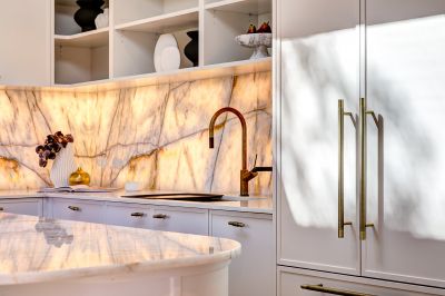 Stunning open plan kitchen with premier appliances, quartz benchtops & backlit splashback